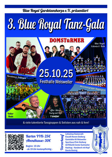 Am Samstag, den 25. Oktober 2025, ist es wieder so weit: Die 3. Blue Royal Tanz-Gala lädt in die Festhalle Eschweiler-Weisweiler ein – zu einem Spektakel für die ganze Familie!